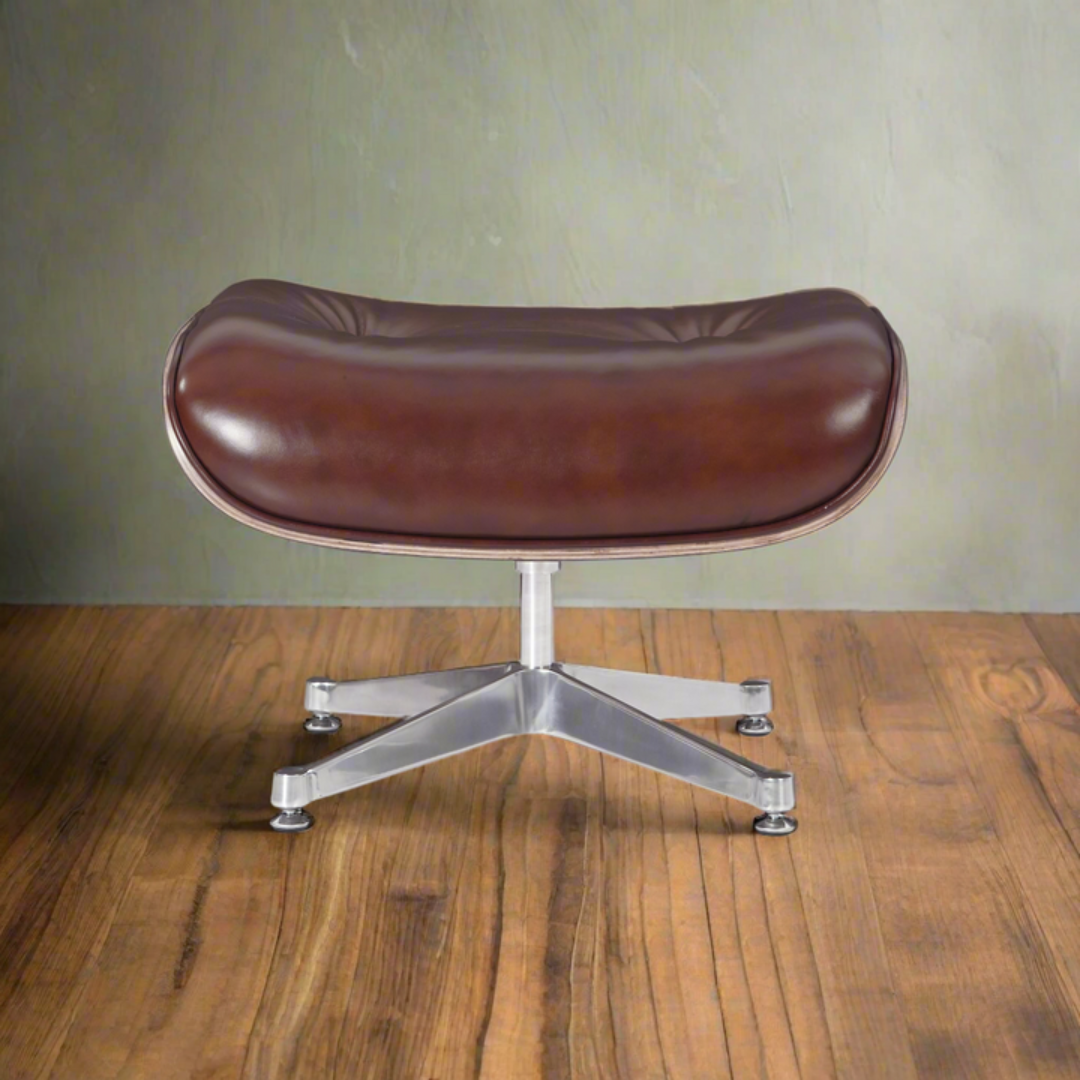 The Replica Eames Lounge Chair and Ottoman comes in several wood finishes: Rosewood, Walnut Wood, and Teak Wood. The ottoman enhances the comfort and visual appeal of the chair. The aluminum base is polished for a modern look, and the ottoman has a 4-star base for added style.