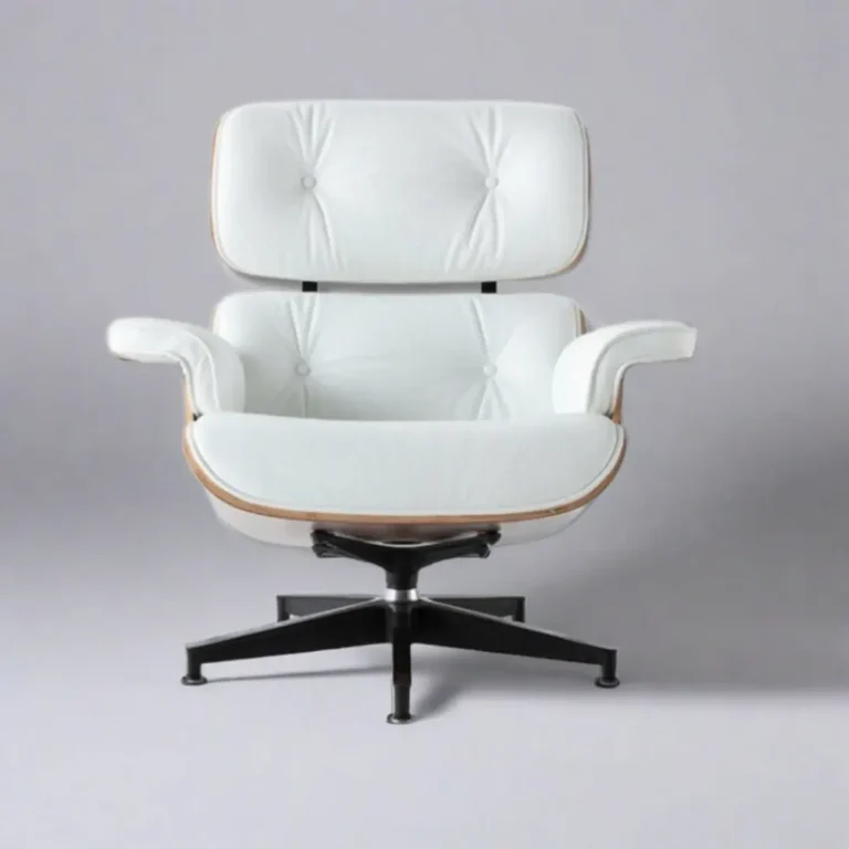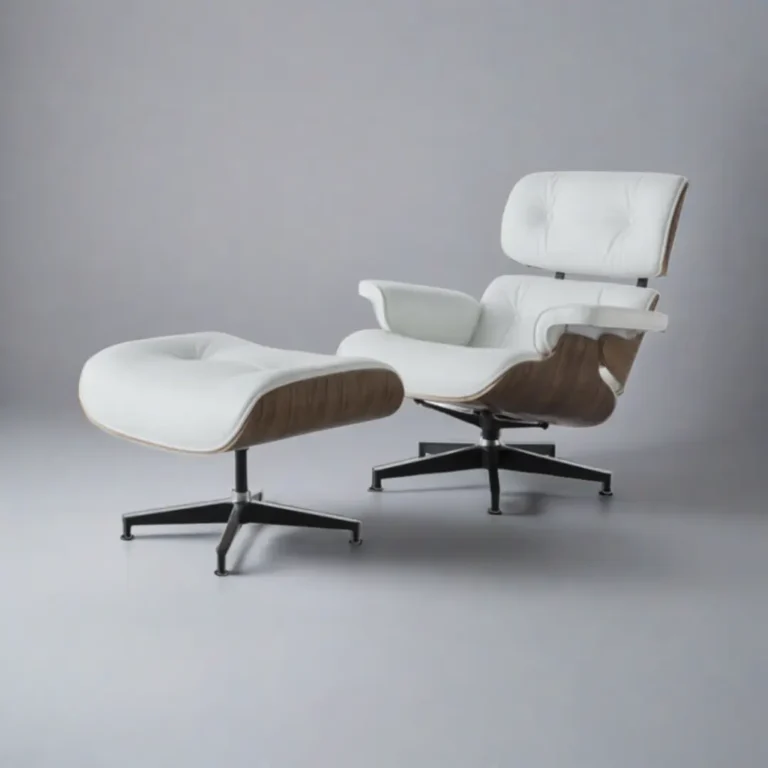 Premium Eames lounge chair replica UK with white leather and walnut wood set from House of Furnishes by Eman. White